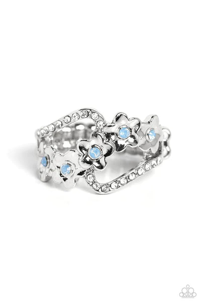 A row of sleek silver daisies with Summer Song opalescent centers curls up the finger for a whimsical floral arrangement. Curls of silver dotted with dainty white rhinestones frames the floral display for additional subtle color. Features a dainty stretchy band for a flexible fit.