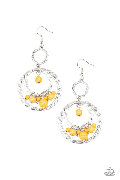 A variety of hammered silver hoops link into a rustic lure. Sunny yellow stone beads cascade from the top and bottom of the centermost hoop, creating an earthy fringe. Earring attaches to a standard fishhook fitting.