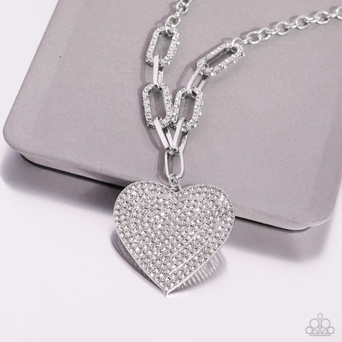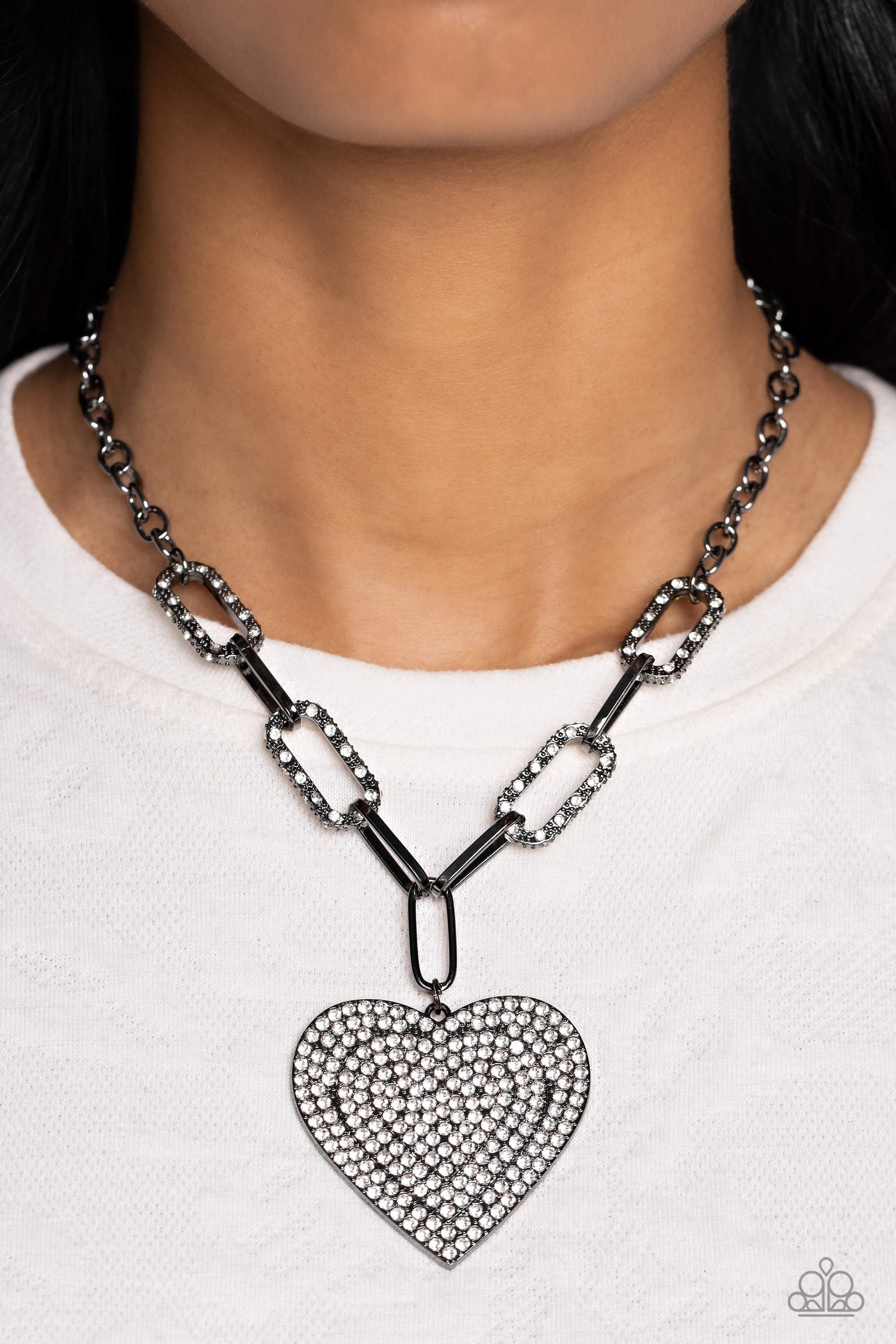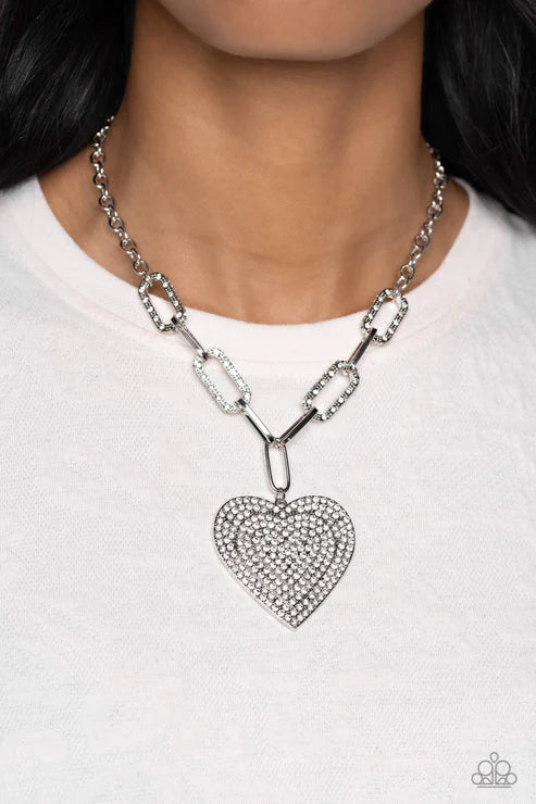 Elongated, oversized gold links, encrusted with a blinding display of white rhinestones and shimmery gold accents connect a classic gold chain to an exaggerated gold heart pendant for a romantically refined finish. Featured on the oversized gold heart, layers upon layers of glitzy white rhinestones emboss across its entire surface as the hearts gradually increase in size from the center. Features an adjustable clasp closure.