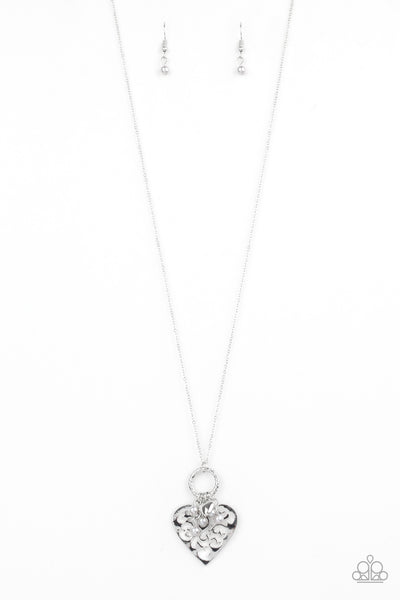 Infused with dainty silver pearls and a shimmery silver heart charm, a stenciled silver heart pendant swings from the bottom of a lengthened silver chain for a whimsical look. Features an adjustable clasp closure.