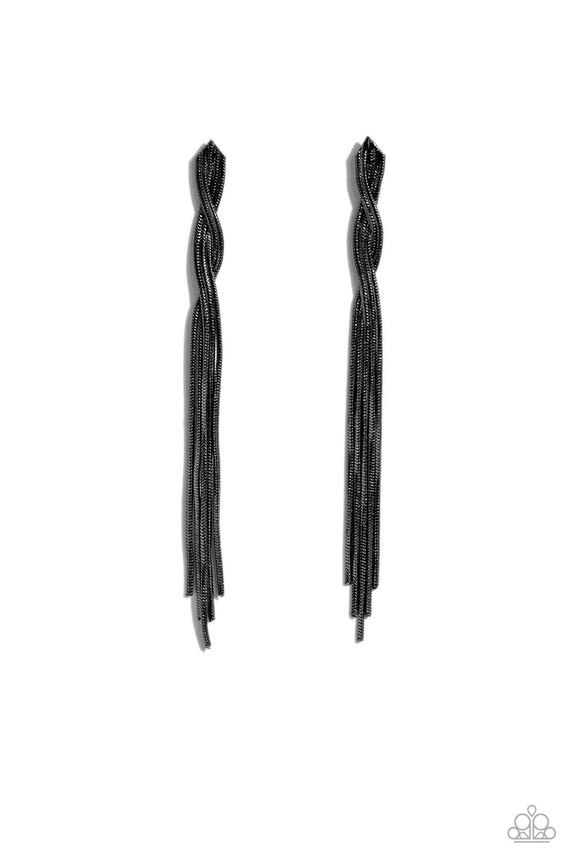 Ropes of gunmetal snake chains gently twist and release into a timeless tassel, resulting in a classic shimmer. Earring attaches to a standard post fitting.