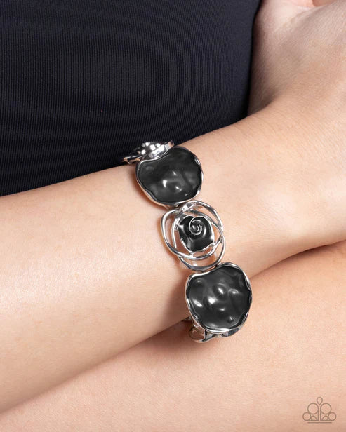 Infused along elastic stretchy bands, a collection of textured black painted-silver abstract discs alternate with airy silver rose frames also embellished with black paint for a whimsically colorful look along the wrist.