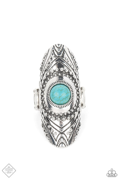 An earthy turquoise stone creates a colorful centerpiece for an oversized elongated silver frame. Embellished with studded texture and geometric designs, the patterned frame results in a hypnotizing lure atop the finger. Features a stretchy band for a flexible fit.
