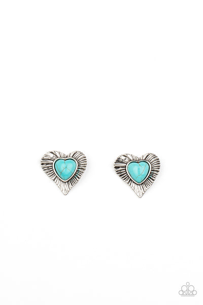 Etched in rustic texture, an antiqued silver frame gathers around a heart shaped turquoise stone center, creating a romantic display. Earring attaches to a standard post fitting.