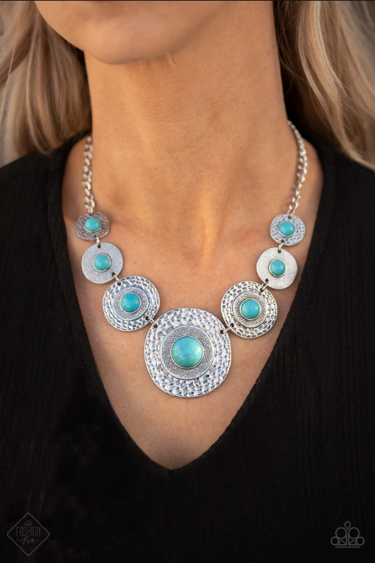 Necklace: "Tiger Trap" (P2SE-BLXX-390RS)-Dotted with refreshing turquoise stone centers, mismatched hammered silver frames gradually increase in size as they link below the collar for a fierce look. Features an adjustable clasp closure.