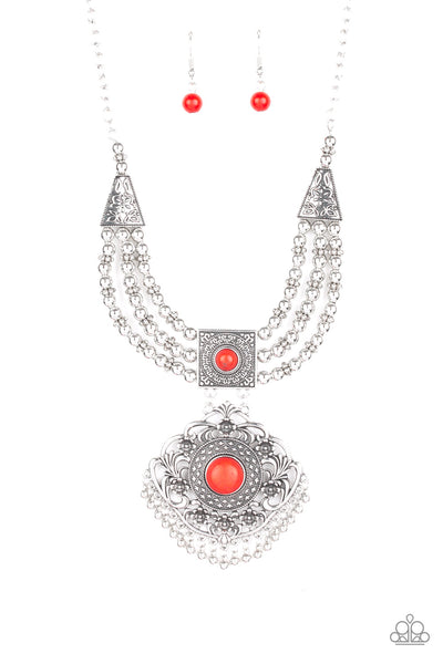 Dotted with fiery red stone centers, two ornate frames link below the collar. Strands of silver beads are threaded through the uppermost pendant, adding an antiqued flair to the tribal inspired pendant. Features an adjustable clasp closure.