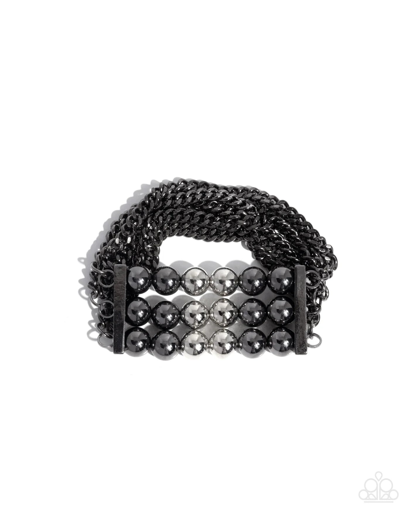 Held in place by vertical gunmetal fittings, copious gunmetal curb chains coalesce around the wrist, highlighting the rows of gunmetal beads that gradually fade to silver beads along the center of the fittings and wrist for a dominantly layered display.