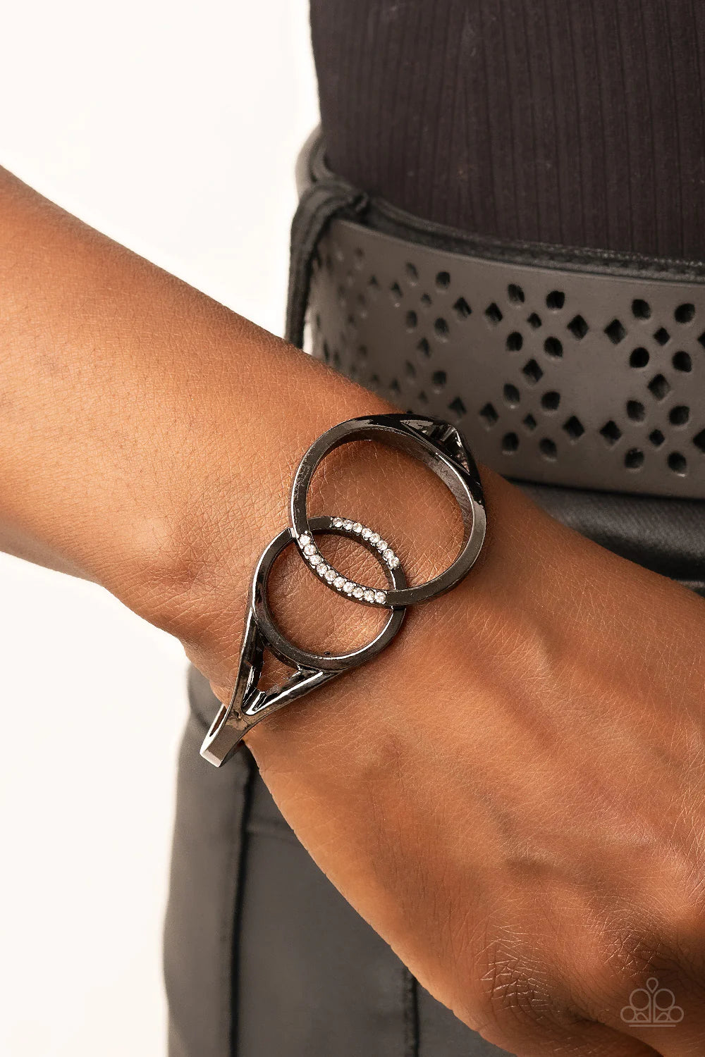 Encrusted in sections of glassy white rhinestones, two oversized rose gold rings delicately overlap across the center of the wrist, resulting in a timeless bangle-like bracelet around the wrist. Features a hinged closure.