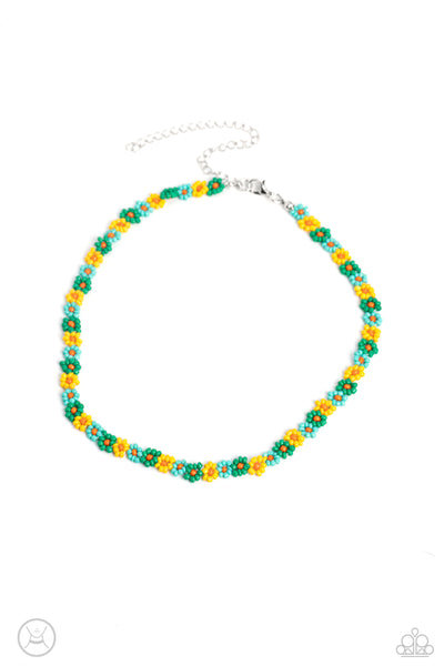 Threaded along an invisible wire along the collar, a lavish collection of seed bead petals in shades of green, Tiffany blue, and yellow bloom around orange seed bead centers for a fanciful floral collection. Features an adjustable clasp closure.