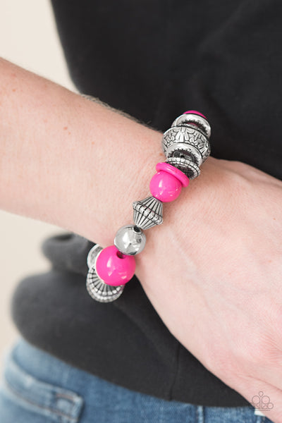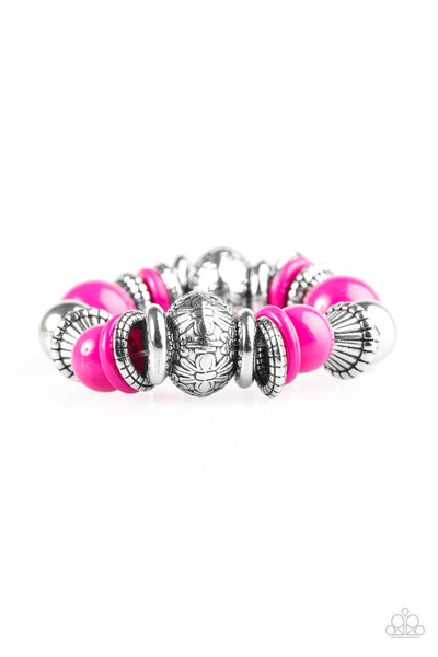 Embossed in a whimsical floral pattern, chunky silver beads, mismatched silver accents, and vivacious pink beads are threaded along an elastic stretchy band for a seasonal look.