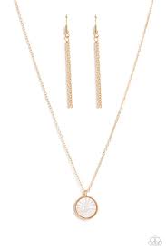 Encased in a sleek gold frame, a white, shell-like disc swings from the bottom of a dainty gold chain below the collar. Embossed onto the iridescent shell, a sun sets over the ocean waves for a beach-inspired statement. Features an adjustable clasp closure.