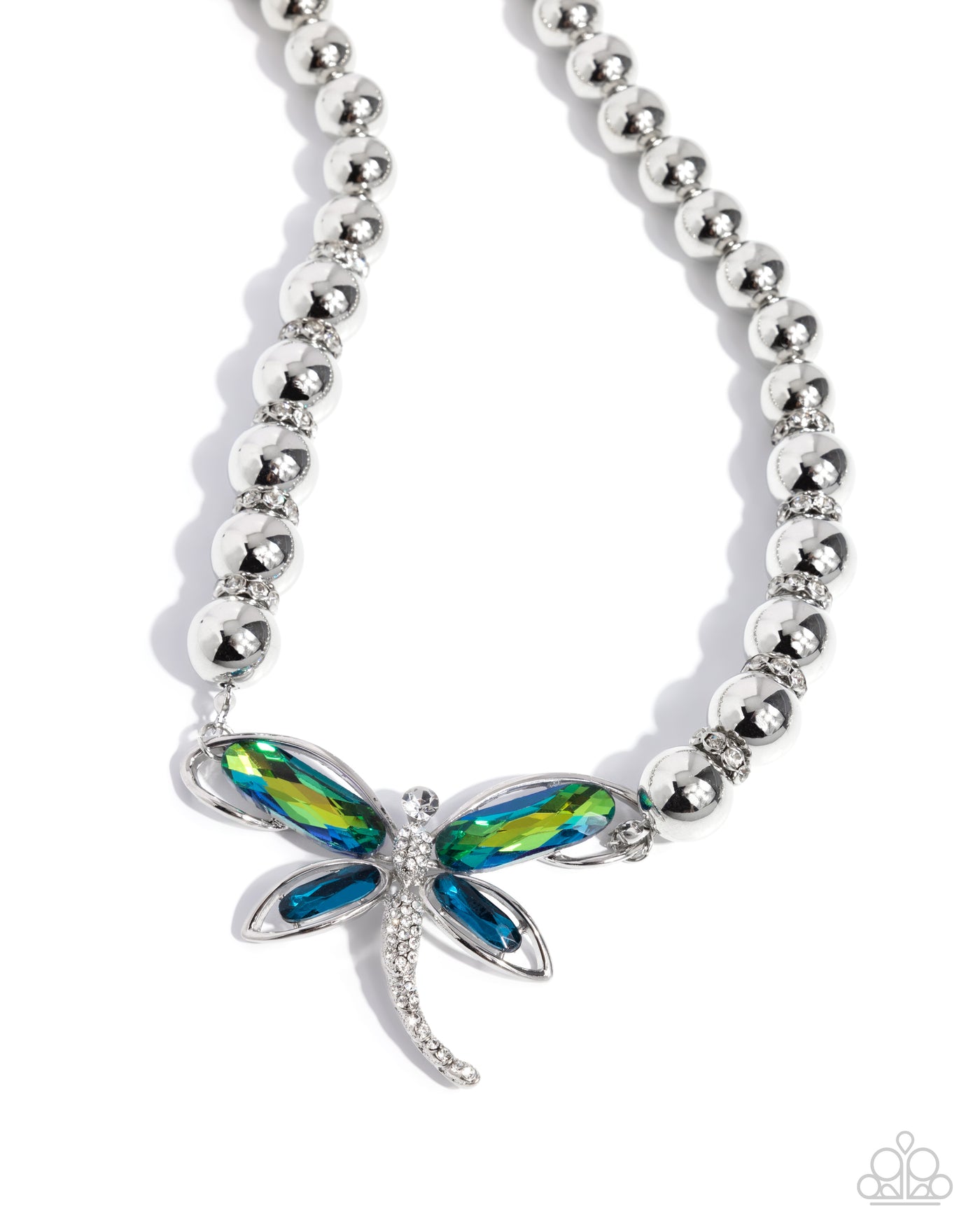 Embellished in white rhinestones, silver floral ornaments alternate with glossy silver beads on an invisible string below the neckline. A three-dimensional silver dragonfly pendant with a white gem head, a body of white rhinestones, UV-splashed blue and green upper wings, and blue oval lower wings flutters atop airy silver wings, connecting to the beaded display for a whimsically wondrous centerpiece. Features an adjustable clasp closure.