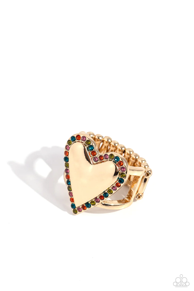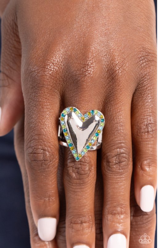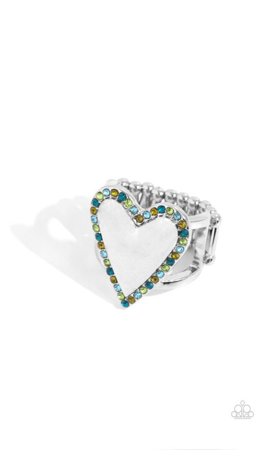 Featured atop airy silver bands, a sleek silver heart is nestled inside a border of various glassy green and blue rhinestones for a glamorously sweet look. Features a stretchy band for a flexible fit.