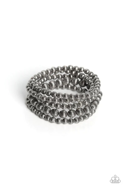Gritty strands of brass beads etched in linear patterns wrap around the wrist on stretchy bands. One strand of the linear brass beads features bigger beads than the rest of the collection for an earthy contrast to the design.