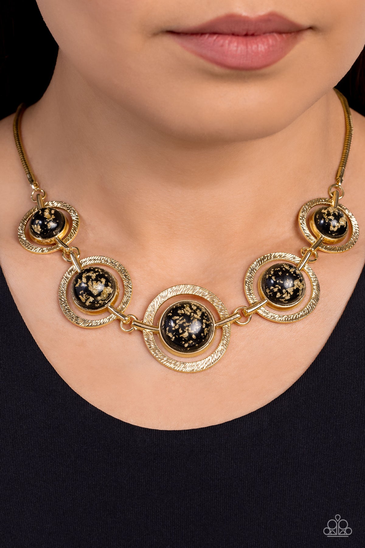 Featuring gold flecks of iridescence, glossy black beads, pressed in sleek gold frames interlock together and span around the collar on a gold snake chain for a sophisticated display. Hammered in delicate shimmer, textured gold hoops encircle each bead, drawing extra attention to its glossy color and gilded details. Features an adjustable clasp closure.