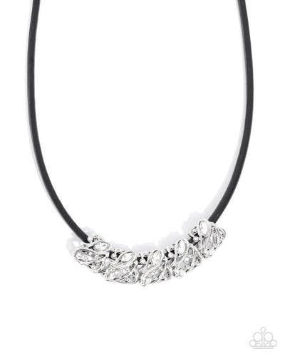 Sporadically dotted with round white rhinestones, silver studs, and marquise-cut white gems, whimsical filigree sprig-inspired silver fittings are infused along a rounded black cord for a radiantly radical display. Features an adjustable clasp closure.