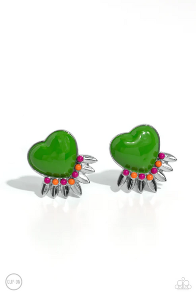A red heart pressed in a sleek silver frame stands out at the ear. Textured silver leaves flare out from a curved cluster of turquoise and yellow beads that adorn the bottom of the heart display, creating a spring-inspired fringe. Earring attaches to a standard clip-on fitting.