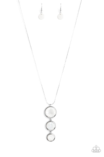 Featuring sleek silver fittings, white shell-like discs gradually increase in size as they connect at the bottom of a dainty silver chain for a summery look. Features an adjustable clasp closure.