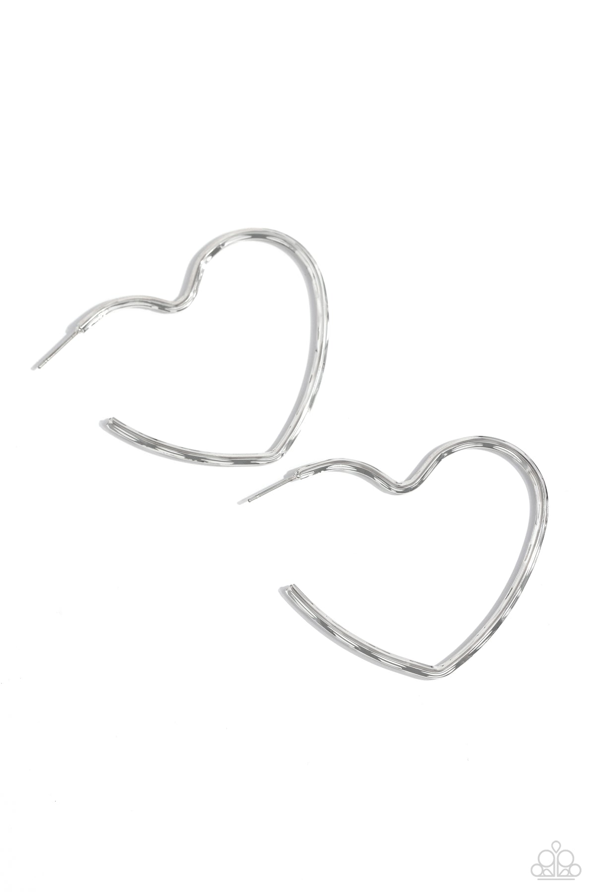 A deceptively simple, thick hoop of silver curves around the ear into a heart-shaped frame. Its curls are complemented by its high sheen finish, leaving a lasting impression. Earring attaches to a standard post fitting. Hoop measures approximately 2" in diameter.