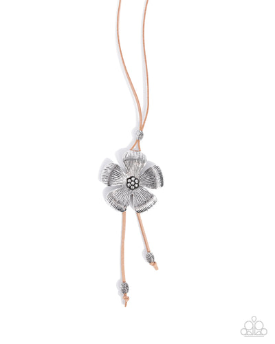 Featuring a mini-beaded floral center, a textured silver flower glides along a light brown cord around the neckline creating an adjustable pendant. Highly-embellished silver floral oval beads cap the ends of the brown cording and rise above the solitaire flower for additional whimsy. Features an adjustable clasp closure.