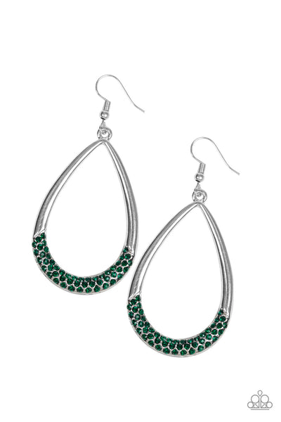 As if dipped in glitter, the bottom of a glistening teardrop rhinestone is encrusted in rows of glassy green rhinestones for a refined flair. Earring attaches to a standard fishhook fitting.