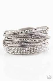 An elongated gray suede band is encrusted in sections of braided white, smoky, and hematite rhinestones and rows of neatly stacked white rhinestones. The elongated band double wraps around the wrist for a fierce one-of-a-kind look. Features an adjustable snap closure.