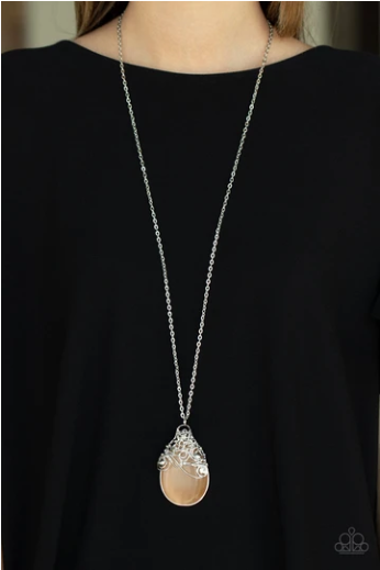 A collection of whimsically twisted wire delicately overlaps across the top of an oversized orange cat's eye teardrop stone, creating an ethereal pendant at the bottom of a lengthened silver chain. Features an adjustable clasp closure.