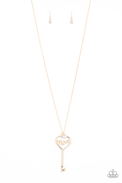 Dotted with dainty white rhinestones, glistening gold filigree spells the word, "Mom", inside a heart-shaped key. Infused with a classic white rhinestone and white crystal-like heart, the airy pendant swings from the bottom of a lengthened gold chain for a charming look. Features an adjustable clasp closure.