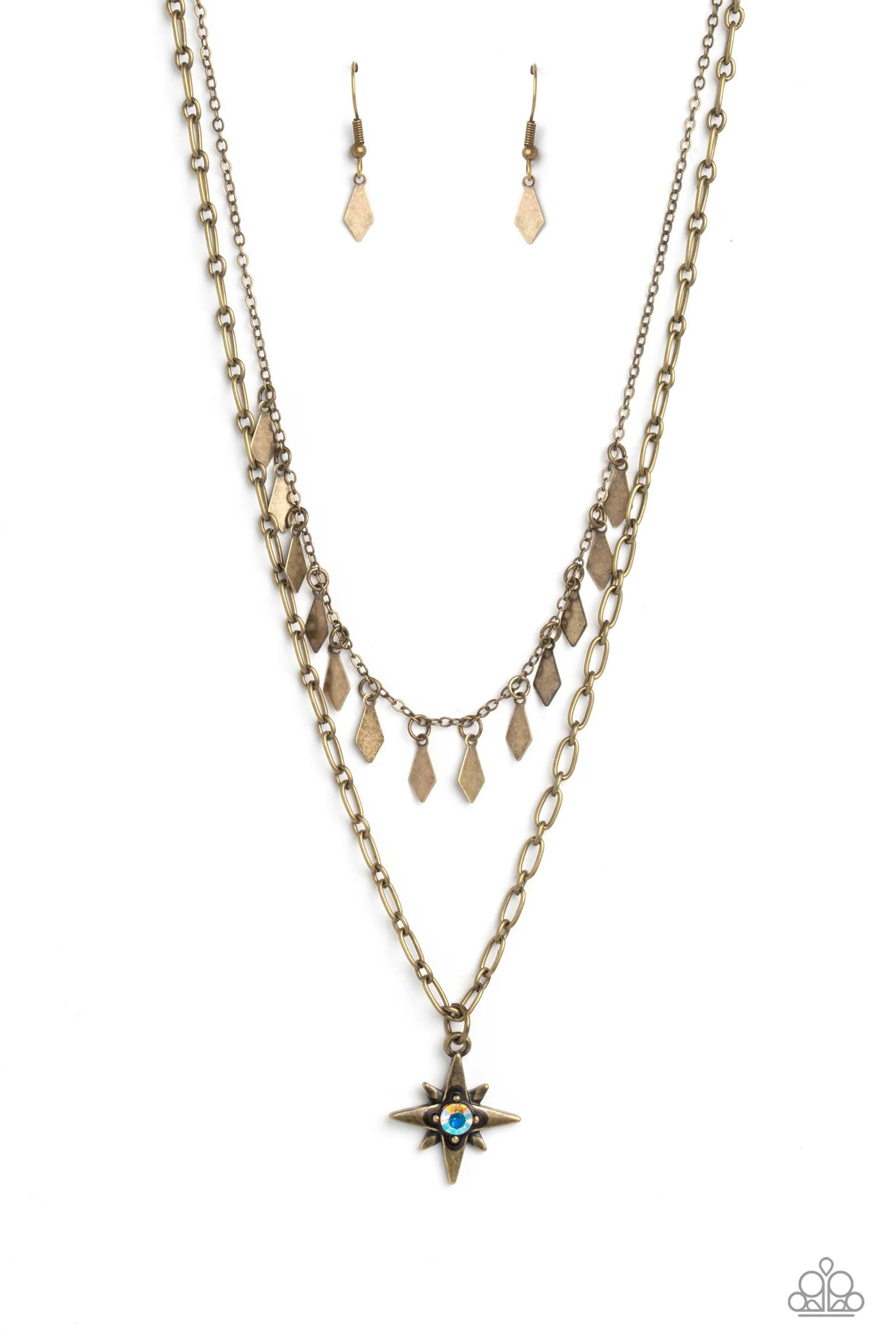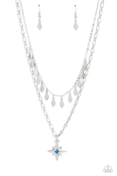 A three-dimensional silver star, dotted with a single blue-iridescent rhinestone glides on a paperclip chain down the neckline for an out of-this-world vibe. Flat and flared silver frames dance above the star pendant from an uppermost chain, adding a shimmery layered look to the refined palette. Features an adjustable clasp closure. Due to its prismatic palette, color may vary.