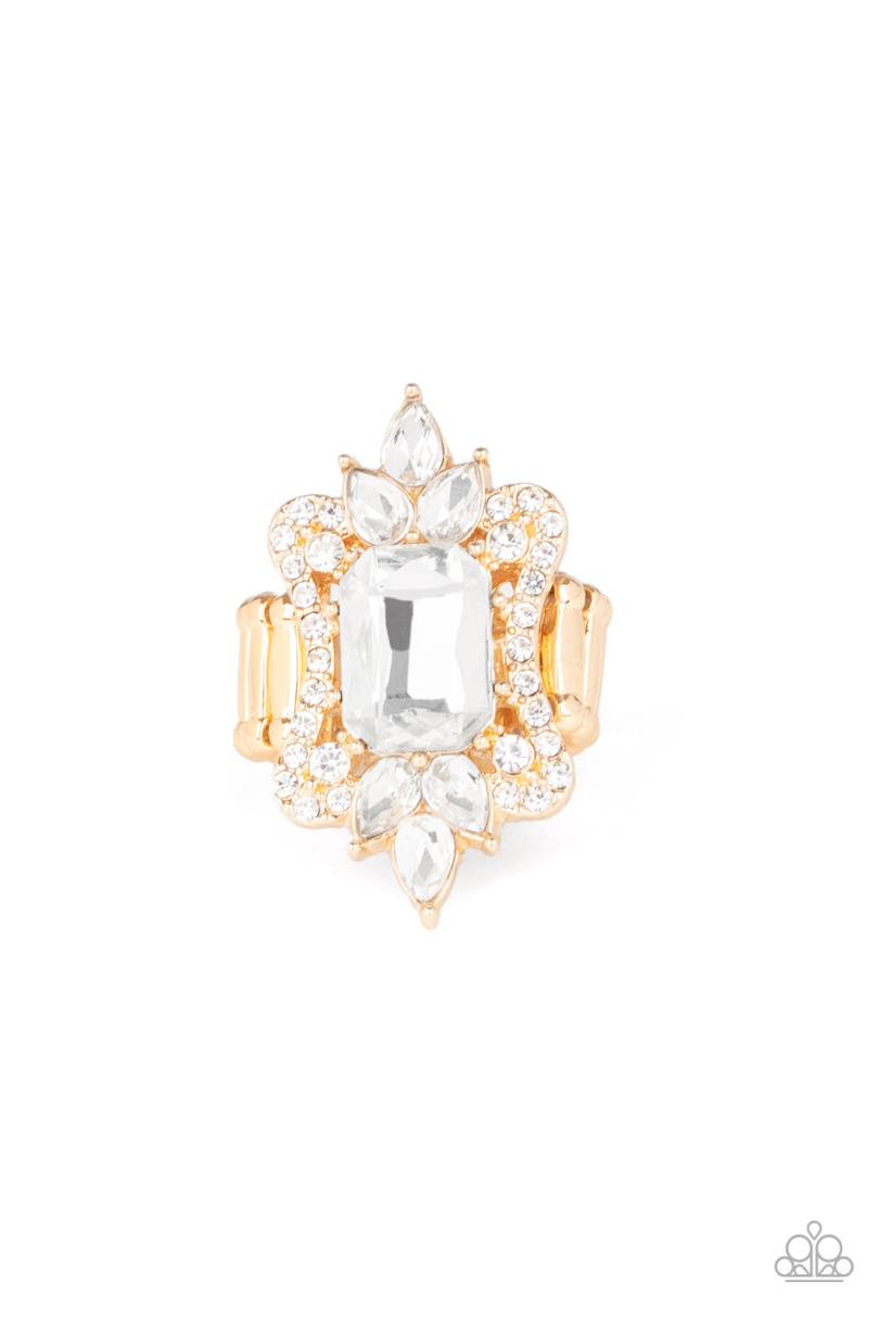 A blinding collection of round and teardrop white rhinestones coalesce around an oversized emerald-style gem, creating a dramatic statement piece atop the finger. Features a stretchy band for a flexible fit.