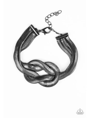 Two thick rows of gunmetal herringbone chain knot into a bold centerpiece atop the wrist. Features an adjustable clasp closure.