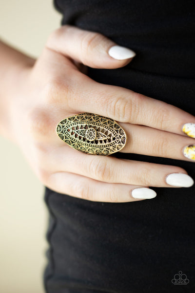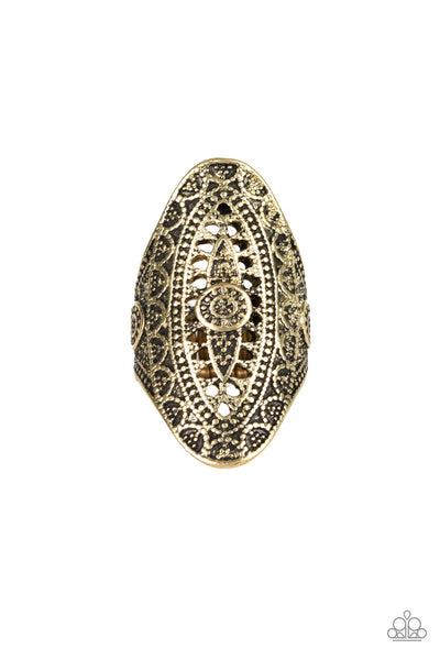 Radiating with studded filigree, an ornate brass oval folds around the finger for a bold tribal look. Features a stretchy band for a flexible fit.