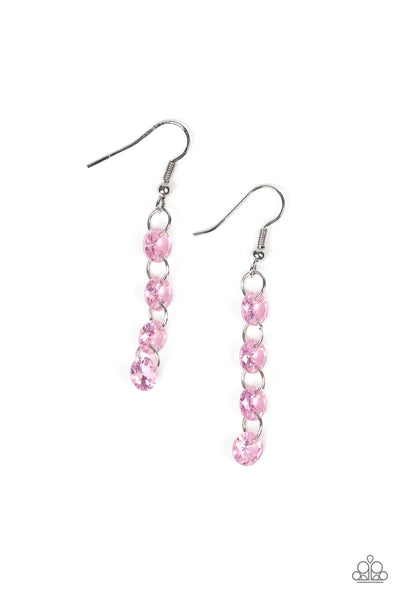 Glassy pink prisms are threaded along dainty silver links as they trickle from the ear, coalescing into a timeless lure. Earring attaches to a standard fishhook fitting.