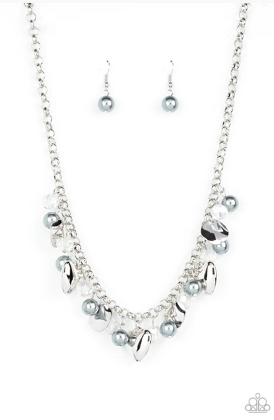A flirtatious collection of silver pearls, glassy white crystal-like beads, crinkled silver discs, and oversized locket inspired silver heart frames dance from a shiny silver chain, resulting in a romantic fringe below the collar. Features an adjustable clasp closure.