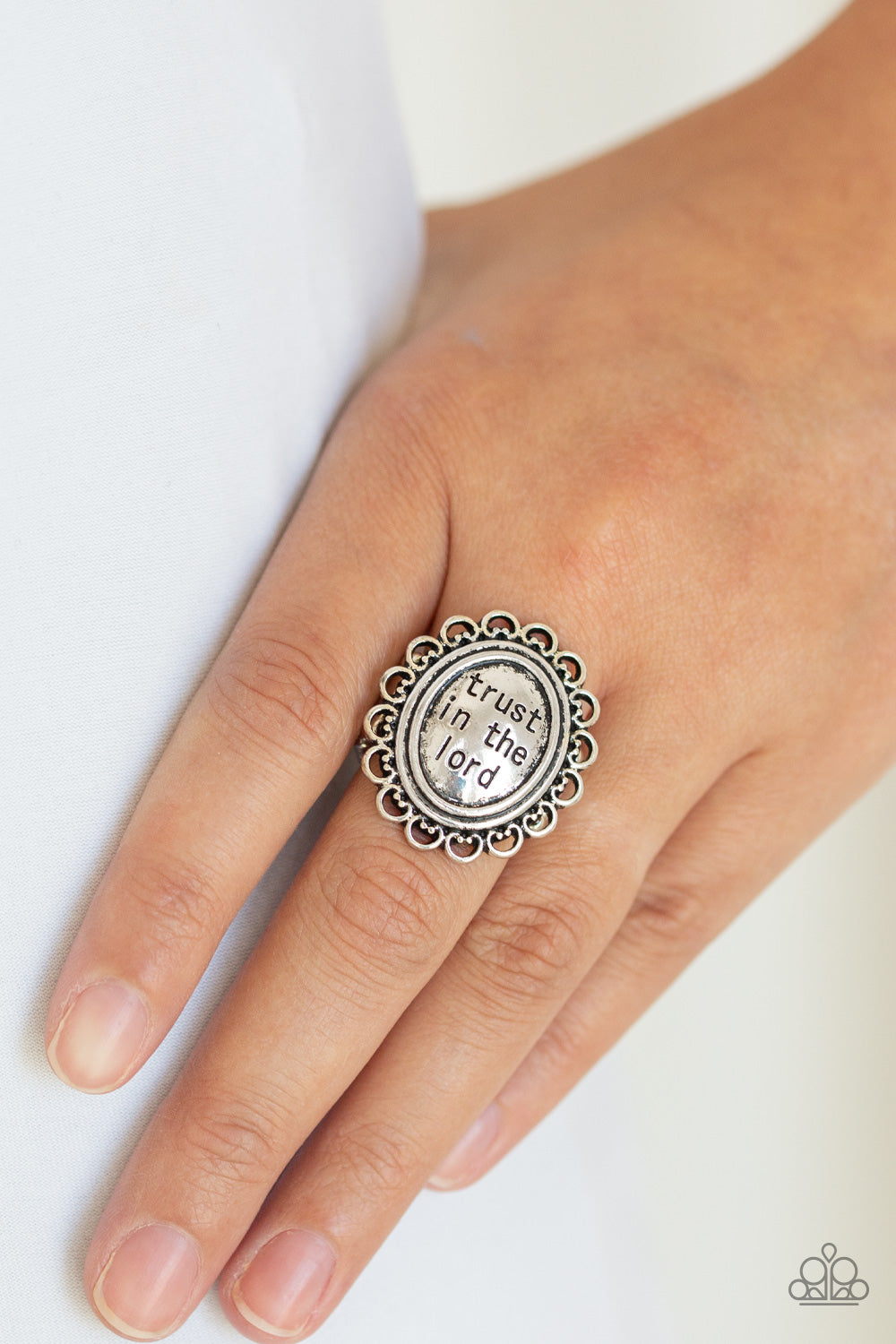 The enlightening phrase, "trust in the lord", is stamped in the center of a frilly silver frame for an inspiring look. Features a stretchy band for a flexible fit.