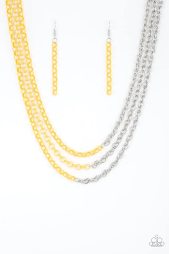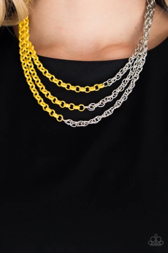 Rows of shimmery silver chains merge with shiny yellow chains, creating colorful layers below the collar. Features an adjustable clasp closure.
