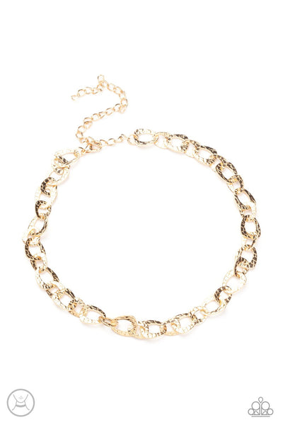 Embossed in a metallic crocodile-like print, asymmetrical gold links delicately connect around the neck for a wild industrial inspired look. Features an adjustable clasp closure.