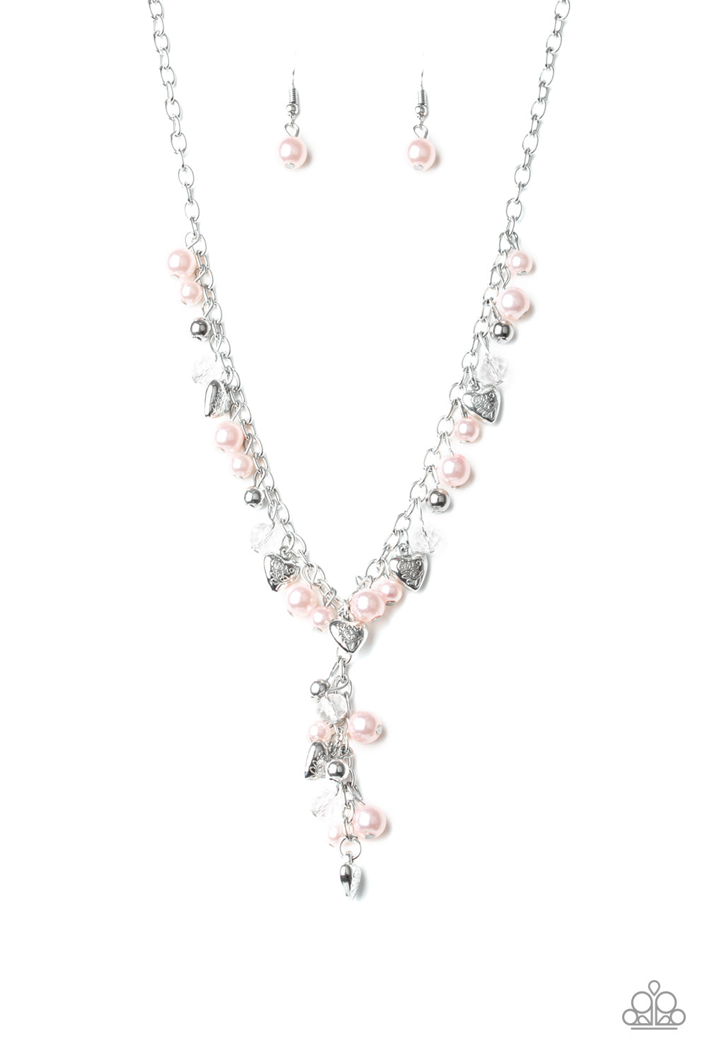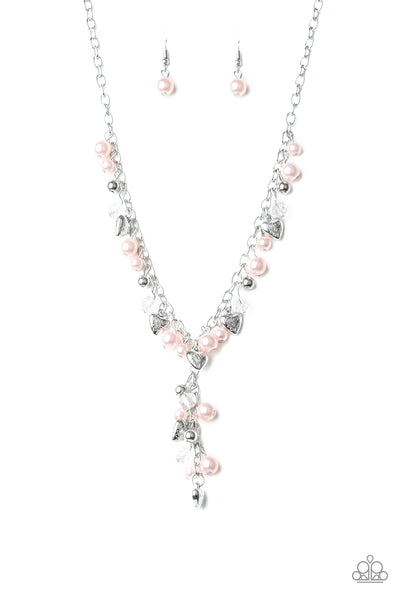 A charming collection of pink pearls, glassy crystal-like beads, and ornate silver heart charms dangle below the collar. Featuring matching beads, an extended silver chain drips from the center for a vintage inspired look. Features an adjustable clasp closure.