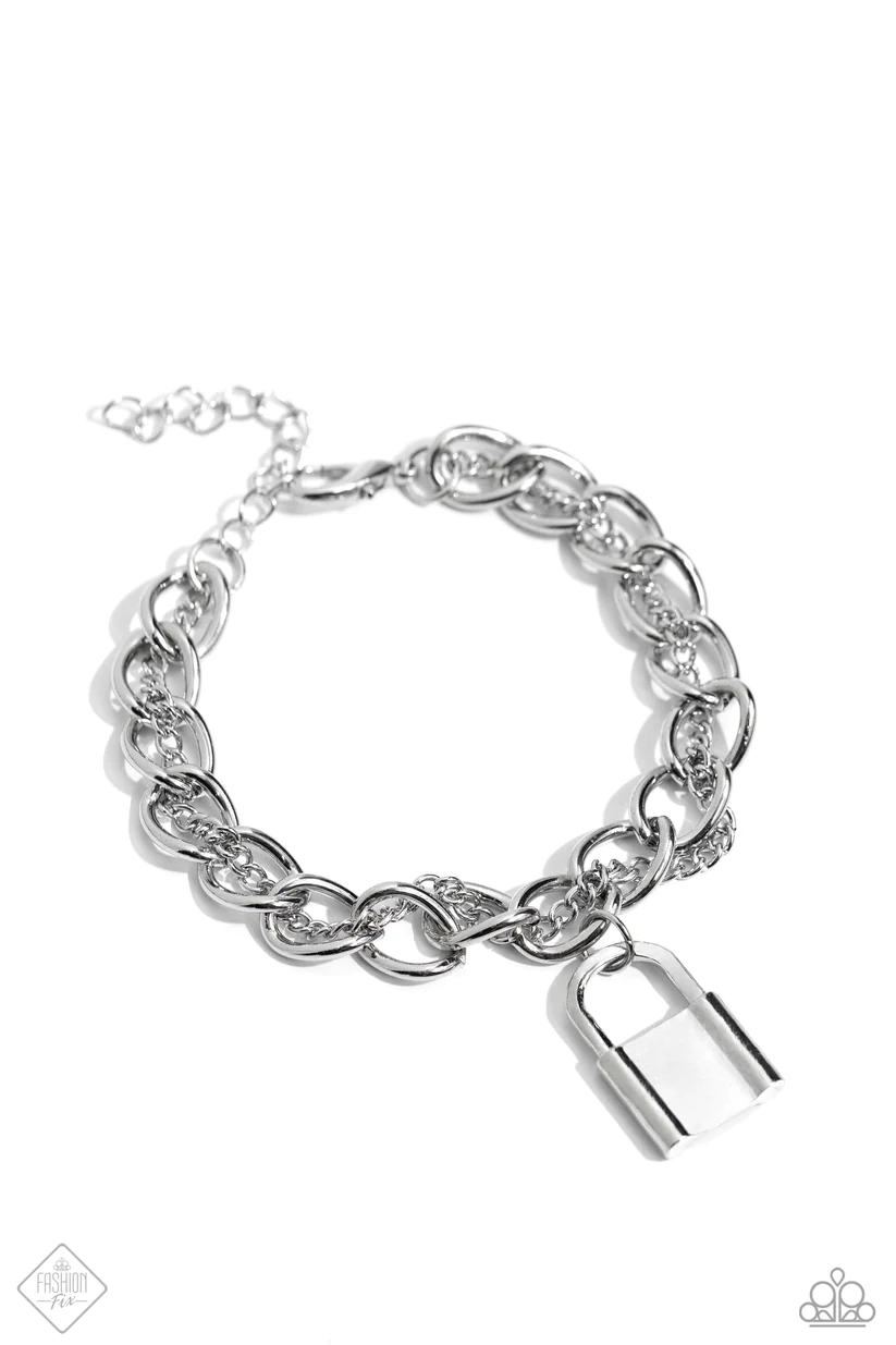 A strand of rounded silver curb chain is infused with a strand of classic silver chain that twists and curves around and through its high-sheen links. A silver lock charm dangles from the mismatched chains for an edgy finish. Features an adjustable clasp closure.