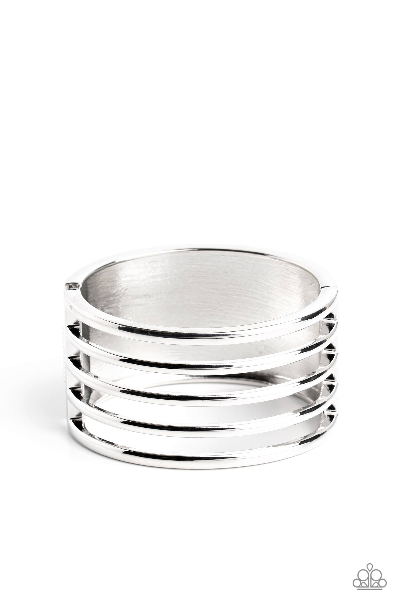 Stemming from a thick silver cuff, glistening bars of silver arc across the top of the wrist for a warrior-worthy finish. Features a hinged closure.