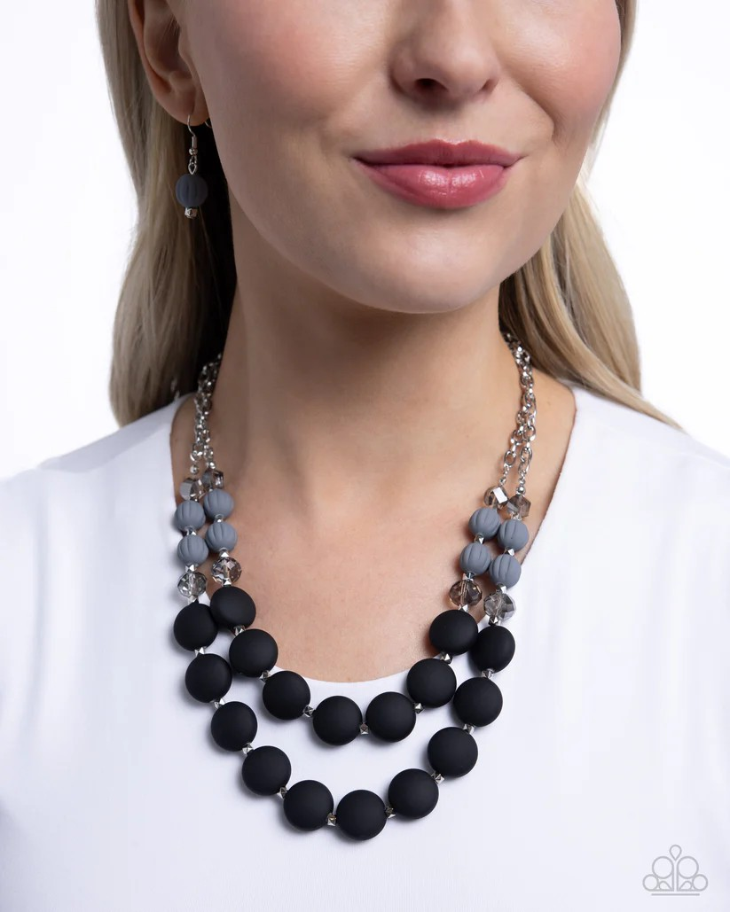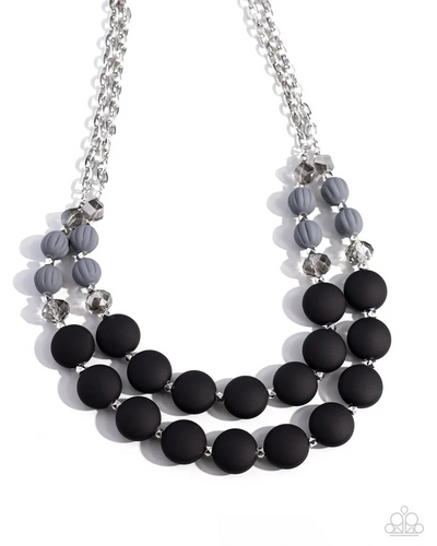 Smoky faceted beads, silver beads, Sharkskin beads, and black matte beads are infused along classic silver chains that layer below the neckline for a colorfully charismatic look. Features an adjustable clasp closure.