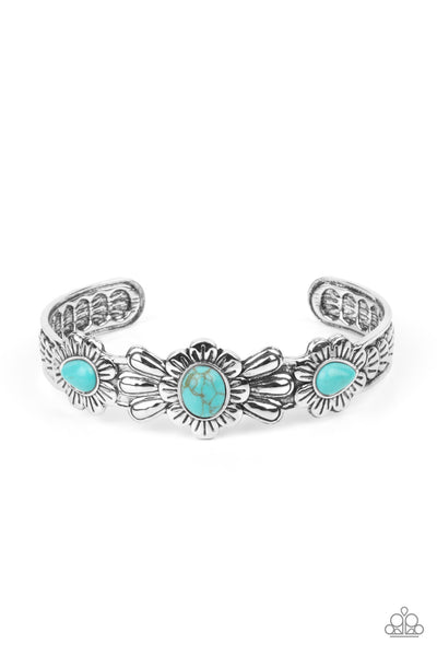 Dotted with turquoise stone centers, a trio of summery wildflowers are embossed across the front of a textured silver cuff for a seasonal pop of color.