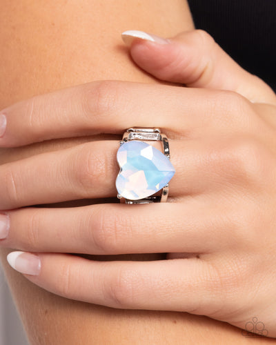 Pronged in the center of an airy, silver band, a blue opalescent heart glitters atop the finger for a youthful, Y2k-inspired centerpiece. Features a stretchy band for a flexible fit.