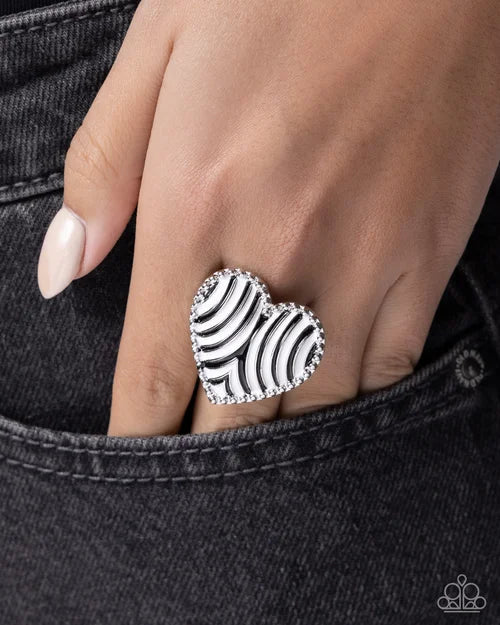 Featuring a silver-studded border, a black-and-white-painted zebra-striped heart stands out atop the finger for a fashion-forward, confident look. Features a stretchy band for a flexible fit.