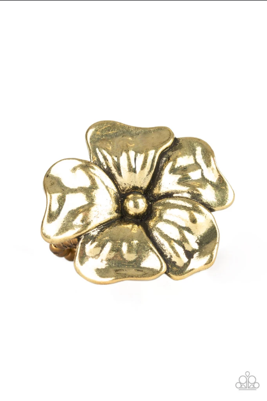 Brushed in an antiqued shimmer, glistening brass petals fold into a tropical inspired flower atop the finger for a seasonal flair. Features a stretchy band for a flexible fit.