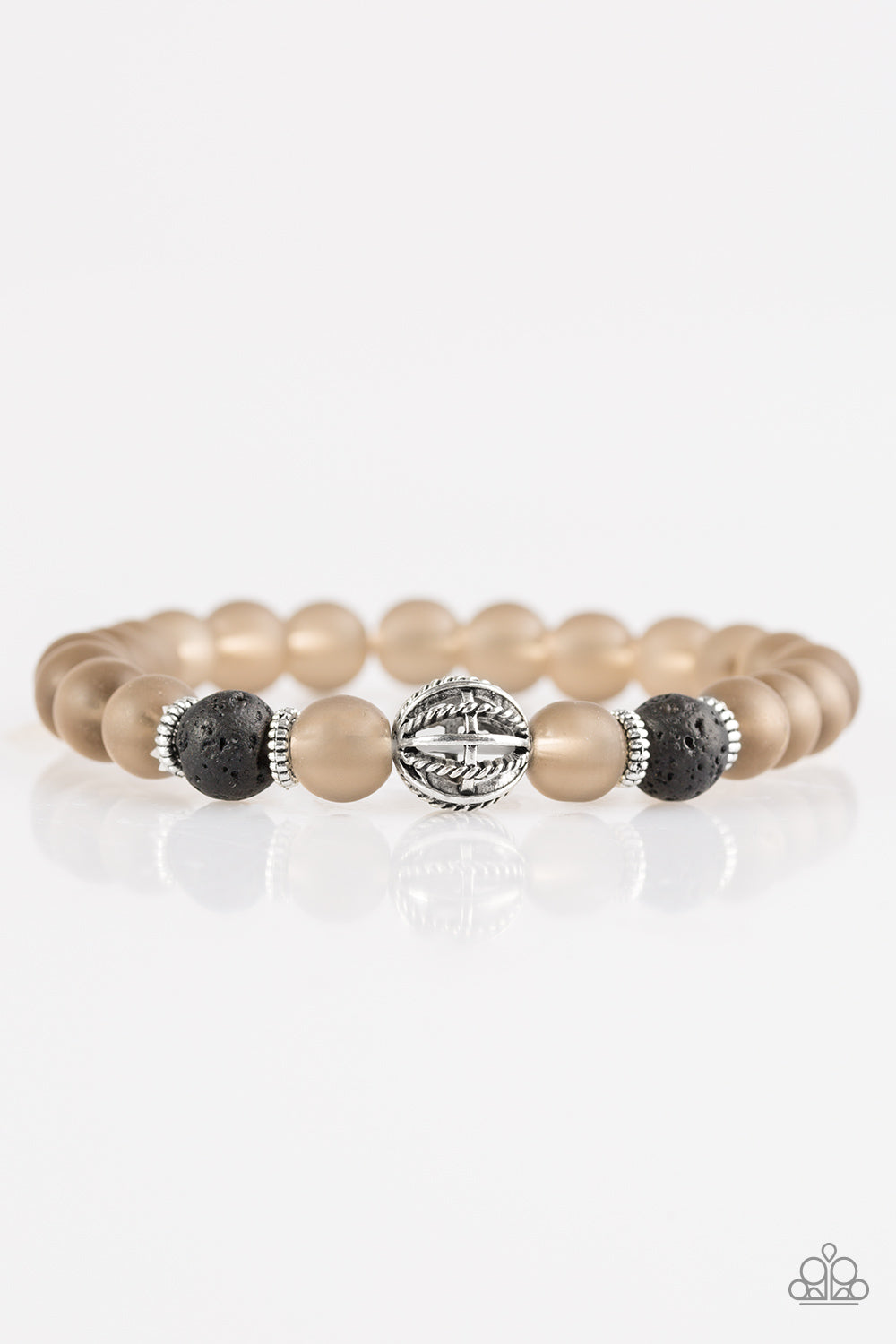 Infused with silver accents, glassy brown and refreshing blue stones are threaded along a stretchy elastic band for a seasonal look.