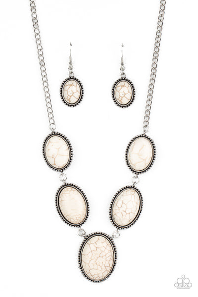 Bordered in rustic silver studded frames, a refreshing collection of oversized white stones delicately link below the collar for a seasonal stone look. Features an adjustable clasp closure.