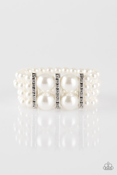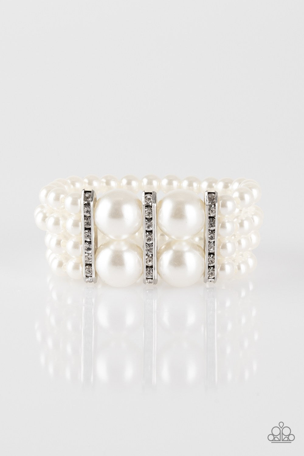 Strands of shiny beads are threaded along stretchy elastic bands and joined together by white rhinestone encrusted frames. The glittery frames combine with oversized beads at the center, adding a dramatic twist to the classic palette. Paparazzi Accessories