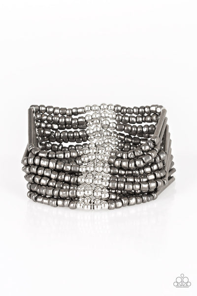 Joined together with metallic fittings, black seed beads are threaded along stretchy elastic bands. Sections of gold beads are sprinkled along the edgy layers, adding hints of shimmer to the seasonal palette.