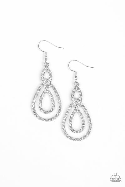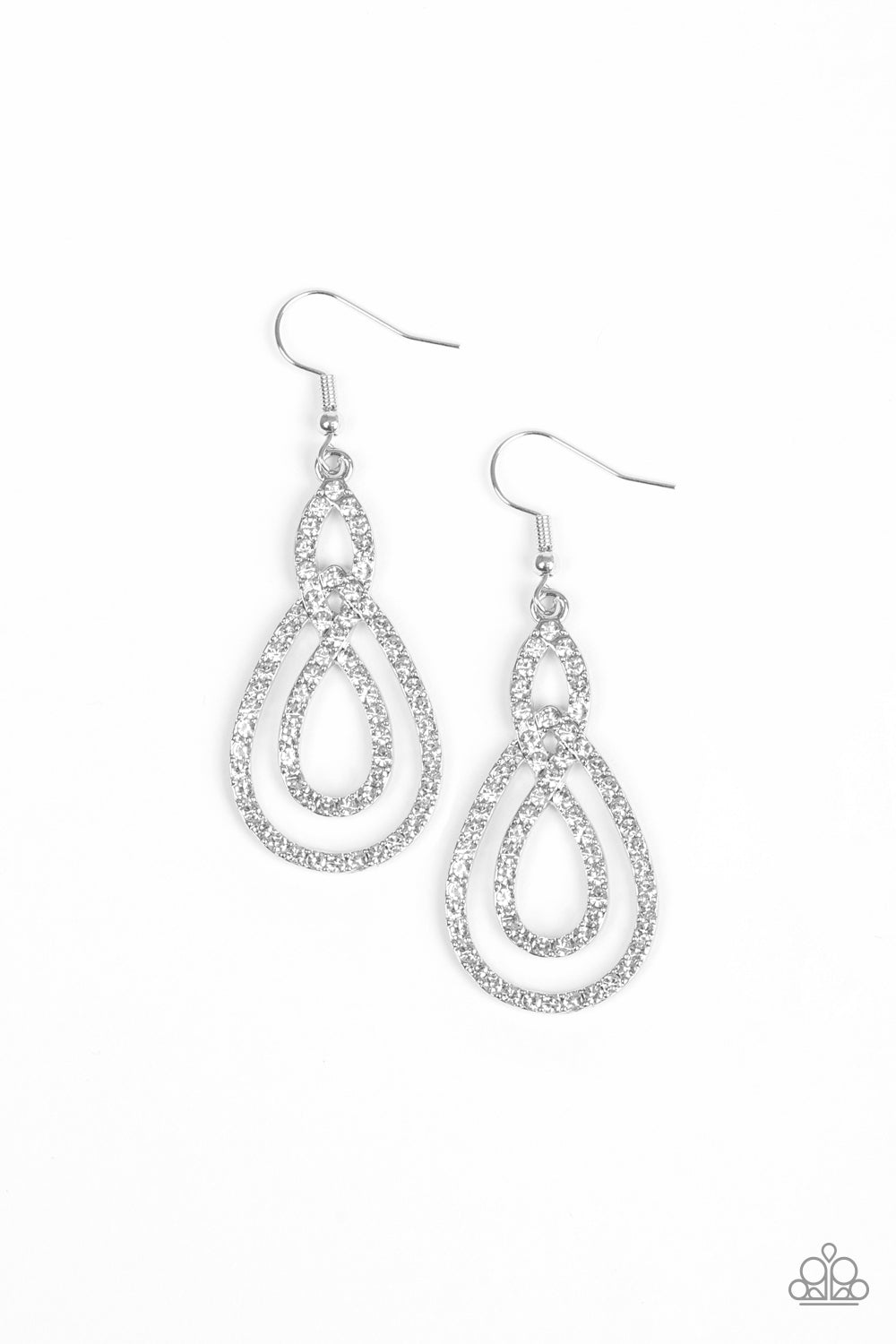 Encrusted in glassy white rhinestones, ribbons of shimmery silver loop into an elegant lure for a timeless look. Earring attaches to a standard fishhook fitting.